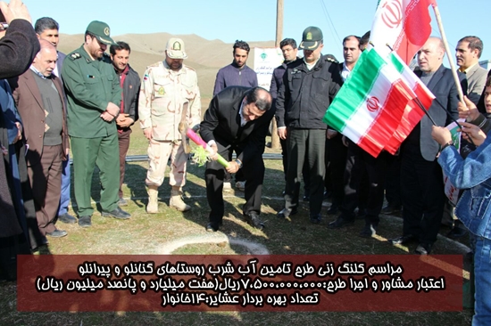 به گزارش پایگاه اطلاع رسانی سازمان امور عشایر ایران به نقل از روابط عمومی آذربایجان شرقی، همزمان با دهه فجر انقلاب اسلامی، مراسم کلنگ زنی تامین آب شرب در کانون های عشایری "گنانلو" و "پیرانلو" بخش مرکزی خداآفرین انجام شد.