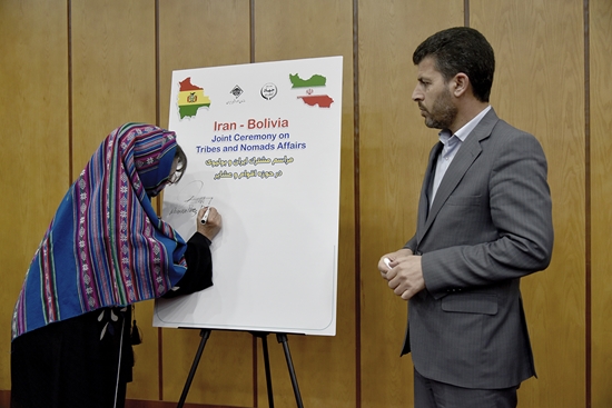 قاب یادبود همایش ایران و بولیوی در حوزه اقوام و عشایر توسط رئیس سازمان امور عشایر ایران و سفیر بولیوی و سفرای 11 کشور در ایران امضا شد.