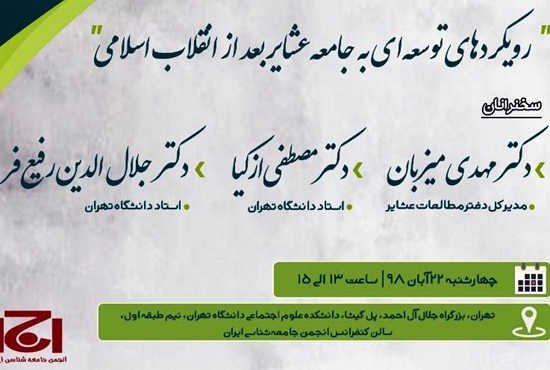 نشست و سخنرانی علمی "رویکردهای توسعه ای به جامعه عشایری بعد از انقلاب اسلامی" با حضور مدیرکل دفتر مطالعات سازمان امور عشایر ایران در دانشگاه تهران برگزار می شود.