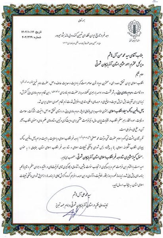 در حکم حجت‌الاسلام والمسلمین سیدمحمدعلی آل هاشم خطاب به سیدمحمدحسن آل هاشم آمده است؛  نظر بهتقارن بعثت نبی مکرم اسلام حضرت ختمی مرتبت محمد مصطفی (ص) با دهه فجر انقلاب اسلامی و با عنایت به اهمیت مراسم چهل و پنجمین پیروزی انقلاب شکوهمند اسلامی، بنا به پیشنهاد رئیس شورای هماهنگی تبلیغات اسلامی و ستاد دهه فجر انقلاب اسلامی استان، جنابعالی را به عنوان "مسئول کمیته عشایری ستاد دهه فجر انقلاب اسلامی استان آذربایجان شرقی" منصوب می نمایم.