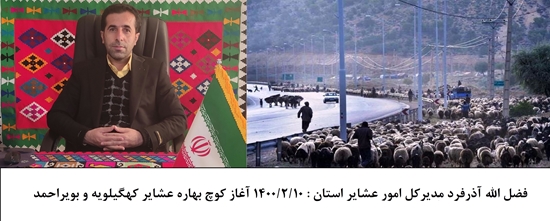 به گزارش پایگاه اطلاع رسانی سازمان امور عشایر ایران به نقل از روابط عمومی امور عشایر کهگیلویه و بویراحمد، فضل الله آذرفرد گفت: برای انجام مطلوب فرایند کوچ، دستگاه‌های اجرایی استان، امور عشایر، منابع طبیعی، علوم پزشکی، سپاه عشایر، نیروی انتظامی، هلال احمر و مدیریت بحران با هم مشارکت می کنند.