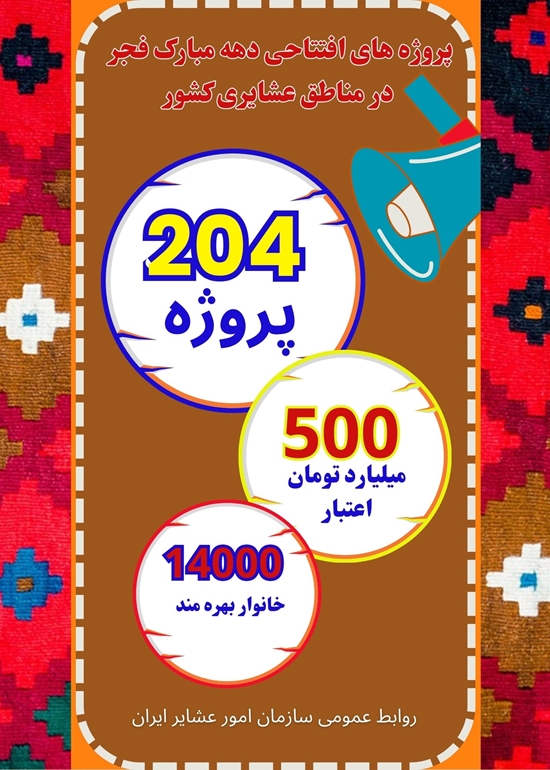 سرپرست سازمان امور عشایر ایران از افتتاح 204 پروژه عمرانی به مناسبت دهه مبارک فجر برای بهبود زندگی در مناطق عشایری کشور خبر داد.