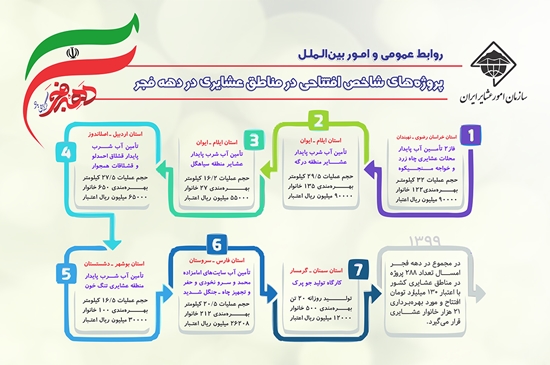 رئیس روابط عمومی و امور بین الملل سازمان امور عشایر ایران افزود: تامین آب کانون های اسکان عشایری "امام زاده محمد" و "سرو نخودی"در شهرستان سروستان استان فارس، پروژه تامین آب آشامیدنی پایدار عشایر منطقه "تنگ خون" در استان بوشهر و همچنین بهرهبرداری از کارگاه تولید جوپرک برای تامین نهاده دامی دامداران عشایری در استان سمنان از دیگر پروژههای شاخصی هستند که در دهه فجر امسال به بهرهبرداری میرسند.