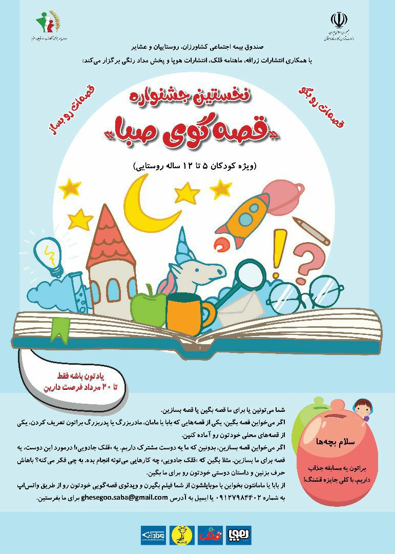 نخستین جشنواره قصه‌گویی کودکان روستائی و عشایری با عنوان "قصه‌گوی صبا" با هدف ترویج فرهنگ قصه‌گویی و ارتقای دانش اقتصادی کودکان روستائی و عشایری، برگزار می شود.