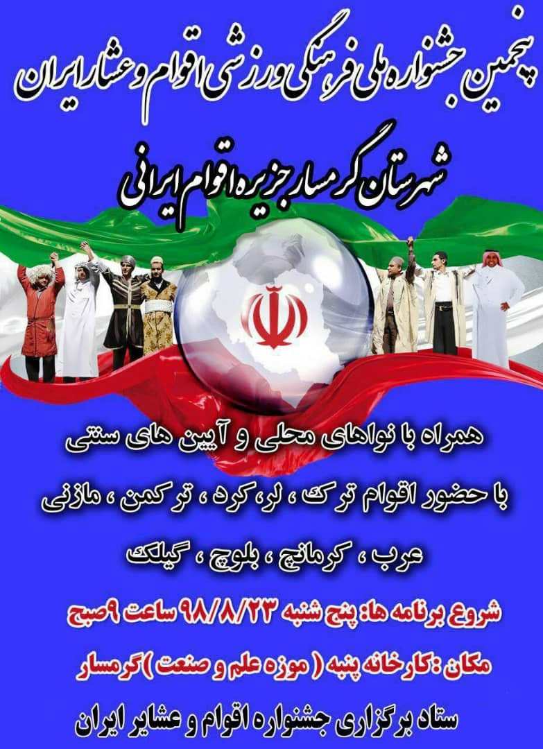 به مناسبت گرامیداشت هفته وحدت و ولادت حضرت محمد (ص) پنجمین جشنواره اقوام و عشایر ایران 23 و 24 آبان ماه به میزبانی شهرستان گرمسار و در محل باغ موزه علم و صنعت این شهرستان برگزار می شود.